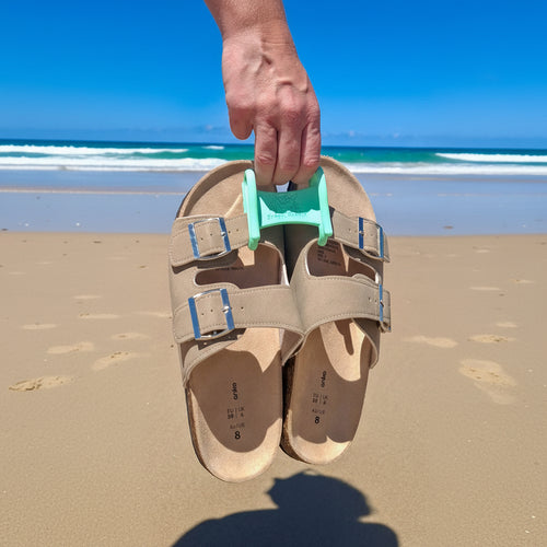 The Sandal Handle is designed to fit most thongs and sandals with standard straps. It works great with thongs and most slide-style sandals.